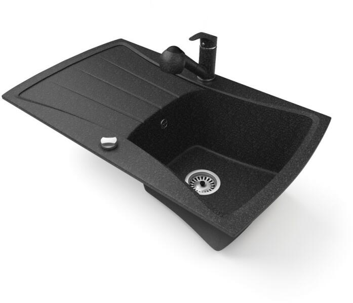 NERO Venezia gránit mosogató szemcsés fekete színben. Egyedi és különleges formával tervezett egymedencés mosogató, kellően nagyméretű csepegtető résszel. A velencei gondolákat idéző, harmonikusan kialakított ívekkel a konyha esztétikus része, emellett anyagvastagságának köszönhetően rendkívül masszív konsktrukció. A mosogatón 2 lyuk található, egy a csaptelepnek