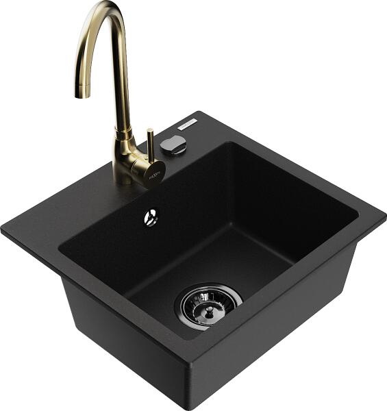 Mexen Milo, 1 kamrás gránit mosogató 435x410x171 mm és Telma arany csaptelep, fekete, 6505-77-670200-50-B Mosogató: Gyártó: Mexen Sorozat: Milo Fekete szín Mérete: 435x410x171 mm Kamra mélysége: 161 mm Kamra méretei: 375x280 mm Lefolyó átmérője: ø90 mm Típus: 1 kamrás Típus: A pult tetejébe süllyesztett Anyaga: gránit (80% gránit adalékanyag 20% gyanta) Túlfolyó lyuk: ig