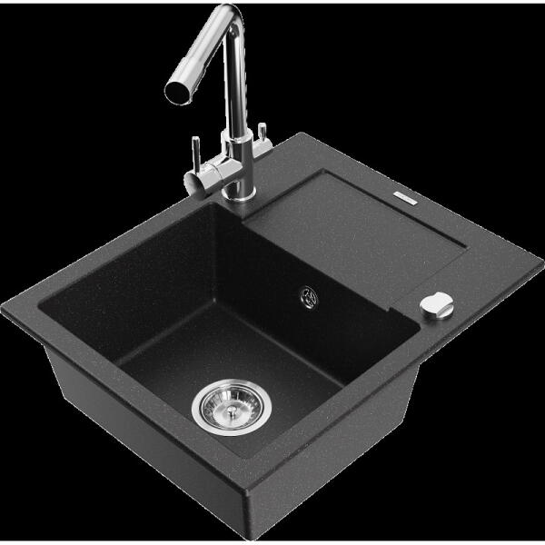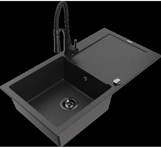 Mexen Leo, gránit mosogató 900x500x190 mm, 1 kamrás és Aster mosogató csaptelep, fekete foltos, 6501-76-73450-57-B Gyártó: Mexen Sorozat: Leo Modell: 1-kamrás s csepegtetővel Szín: fekete foltos Felületkezelés: sima Beépítés: felülről a munkalapba süllyesztve Hossza 900 mm Szélesség 500 mm Magasság: 190 mm Kamra mélysége: 180 mm Kamra mérete: 430x415 mm 500 mm-es méretű s