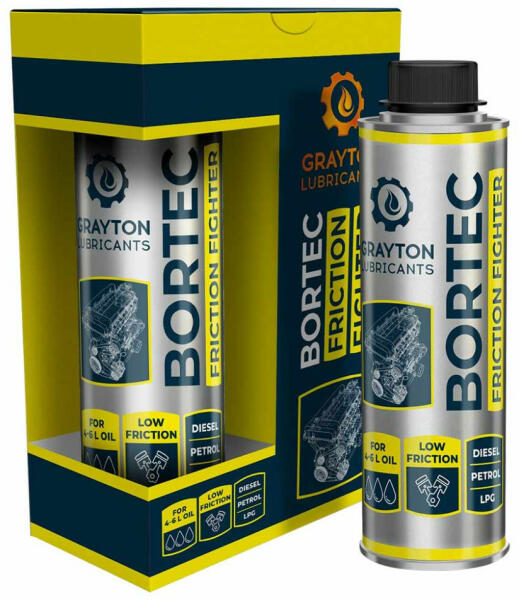 Grayton Bortec Friction Fighter 80030 súrlódás- és kopáscsökkentő motorolaj-olajadalék, 250ml Új generációs, hamumentes, bór-észter-alapú súrlódáscsökkentő és antioxidáns termék, amely egyedülálló tulajdonságokkal ruház fel bármely szabványos motorolajat. Kitűnően működik együtt más súrlódáscsökkentő termékekkel az ásványi és szintetikus motorolajokban.
