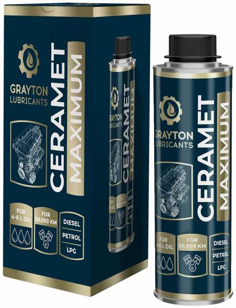 Grayton Ceramet Maximum 80031 kerámia motorolaj adalék, 250ml Kerámia alapú olajadalék, amely a fémfelületbe épülve növeli a felületek kopásállóságát akár 50.000 kilométeren keresztül, ezáltal lényegesen meghosszabbítja a fémfelület élettartamát. Csökkenti a súrlódást, a kopást és a motorzajt. Csökkenti az üzemanyag fogyasztást és javítja a motor teljesítm