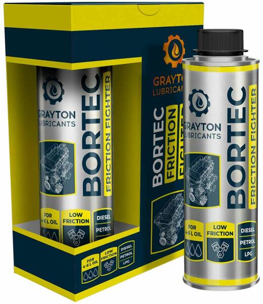 Grayton Bortec Friction Fighter 80030 súrlódás- és kopáscsökkentõ motorolaj-olajadalék, 250ml Új generációs, hamumentes, bór-észter-alapú súrlódáscsökkentõ és antioxidáns termék, amely egyedülálló tulajdonságokkal ruház fel bármely szabványos motorolajat. Kitűnõen működik együtt más súrlódáscsökkentõ termékekkel az ásványi és szintetikus motorolajokban.