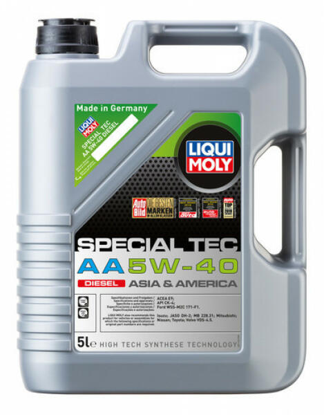 5W-40 motorolaj Leírás: A Liqui Moly Special Tec Asia & America AA 5W-40 diesel prémium kategóriás, modern üzemanyag-takarékos motorolaj. A szintetikus technológián alapuló alapolajok és legújabb adalékok kombinálása révén kiváló védelmet nyújt kopás ellen, csökkenti az olaj- és az üzemanyag-fogyasztást, és a motor gyors átolajozásáról gondoskodikAlkalmazási ter