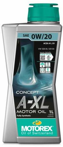 MOTOREX CONCEPT A-XL 0W-20 (1 L) (VW 508/509) , Jóváhagyások: ACEA A1/B1-12 VW 508 00 VW 509 00 Teljesen szintetikus, szuper alacsony súrlódású, high-tech öszzetételű kenőanyag nyújtott szervízintervallumos benzine vagy dízel (Long-Life) motorokhoz. Üzemanyag takarékos, mérsékelt emissziót elősegítő motorolaj. Kimondottan a Volkswagen csoport szivattyú fúvókás (PDTI) szem