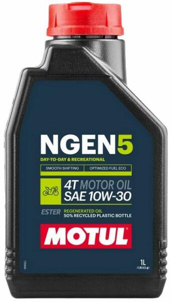 innovatív, a fenntarthatóság jegyében készített motorolaj négyütemű motorkerékpárokhoz A Motul NGen5 4T 10W-30 innovatív, a fenntarthatóság jegyében készített motorolaj négyütemű motorkerékpárokhoz. Szintetikus észterekkel, magas színvonalat képviselő alapolajokkal, nagy teljesítményű adalékanyagokkal és 75%-ban regenerált olajokkal előállított új generációs k