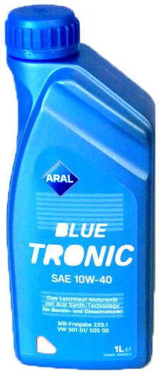 Termék részletekARAL BLUE TRONIC 10W-40 1 Liter termék, ásványolaj bázisú, szintetikus technológiával készített többfokozatú motorolaj, benzin és dízel és turbós motorokhoz. Specifikációk: ACEA A3/B3, API SL/CF, VW 505 00, MB 229.1 Tulajdonságai és előnyei: Az Aral szintézis technológiájával gyártott könnyű futású motorolaj. A speciális gyártástechnológia és a különleges adalé