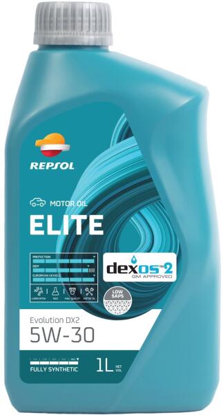GM Dexos2 jóváhagyású 5W30-as motorolaj A Repsol Elite Evolution DX2 5W-30 egy hosszú élettartamú szintetikus kenőanyag, amelyet kifejezetten kipufogógáz-feldolgozással rendelkező járművekhez terveztek. Gondosan összeállított, alacsony hamutartalommal (Mid SAPS), ami alkalmassá teszi a jelenlegi motorok legújabb technológiáihoz, és a káros részecskekibocsátás minimálisra