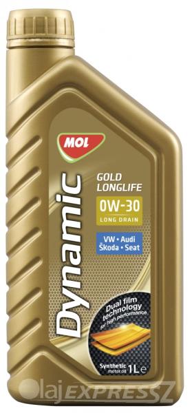 MOL Dynamic Gold Longlife 0W30 1L MOL DYNAMIC GOLD LONGLIFE 0W-30 1L A legmodernebb gépjárművek szintetikus, prémium motorolaja Általános információ: Csúcsteljesítmé nyű, szintetikus, alacsony hamutartalmú, hosszú csereperiódusú motorolaj, amely rendelkezik a Volkswagen-csoport vezető személygépkocsi márkáira (VW, Audi, SEAT, Skoda) vonatkozó, megnövelt szervizintervallumra