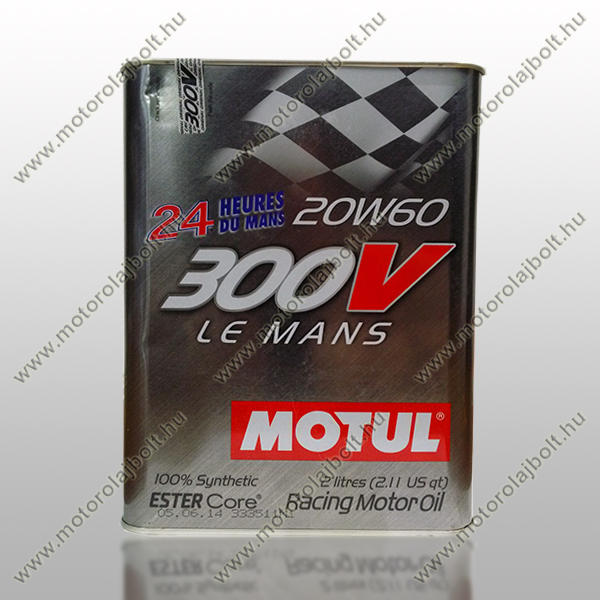 Termék részletek300V LE MANS SAE 20W-60, DUPLA ÉSZTER TECHNOLÓGIÁS TELJESEN SZINTETIKUS MOTUL 300V Le Mans minden évszakban használható, teljesen szintetikus, észter bázisú, motorsportban használatos olaj turbófeltöltős vagy többszelepes versenymotorokhoz kifejlesztve. Lehet használni szériagyártású Otto és Diesel motoros járművekhez is. A versenysportban főleg hosszútávú versenyeknél a