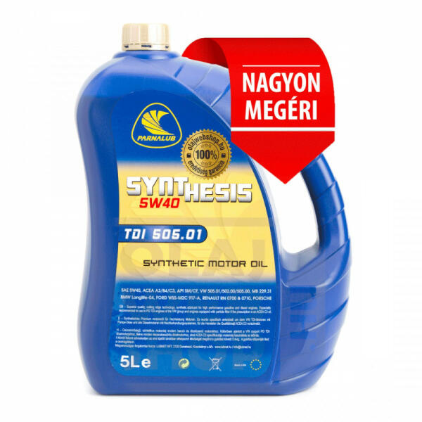 5W-40 motorolaj A PARNALUB Synthesis TDI 505.01 5w-40 egy csúcsminőségű, 100% -ban szintetikus Mid SAPS motorolaj, benzin, és diesel motorokhoz. ( pl. VW PD TDI ) Teljesíti a legmagasabb követelményeket. Specifikációk:API SM/CF, ACEA A3/B3/B4/C3, VW 502.00 / 505.00 / 505.01, MB 229.31, BMW Longlife-04, FORD WSS-M2C 917-A, RENAULT RN 0700 / 0710