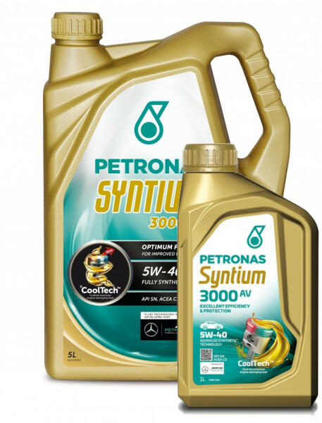 A CSOMAG TARTALMA PETRONAS SYNTIUM 3000 AV 5W-40 1db 5Literes és 1db 1Literes termék API SN ACEA C3 VW 502.00-505.01 gépgyártói jóváhagyás MB-APPROVAL MB 229.51 gépgyártói jóváhagyás BMW LL-04 PORSCHE A40 RENAULT RN0700/RN0710 FCA 955535-S2 FORD WSS-M2C917-A Performance A PETRONAS Syntium 3000 AV 5W-40 egy teljesen szintetikus, °CoolTech technológiával készült, hatékony hőszab