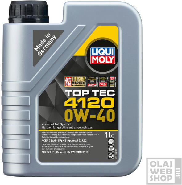 modern nagy teljesítményű személygépkocsik és kisáruszállítók 0W40-es motorolaja A Liqui Moly Top Tec 4120 0W-40 egy teljesen szintetikus, high-tech, alacsony súrlódású motorolaj. Optimális kenést és kiemelkedő kenőfilm-stabilitást, valamint minimális kopást és a legkisebb lerakódásokat biztosítja még extrém terhelés mellett is. Ideálisan alkalmas start/stop rendszerr