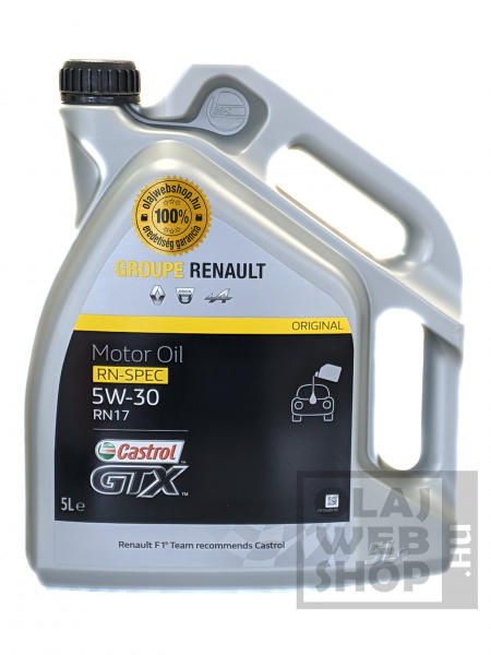 RENAULT RN 17 Termékleírás A Renault - Castrol GTX RN-SPEC 5W-30 RN 17 teljesen szintetikus motorolaj. Mindazokhoz a benzin- és dízelüzemű motorokhoz alkalmas, amelyekhez RN 17 jóváhagyású motorolaj használatát írták elő. A legszigorúbb minőségi követelményeknek is megfelel, széles hőmérsékleti tartományban gyors átolajozást biztosít, így hatékonyan hozzájárul a mo