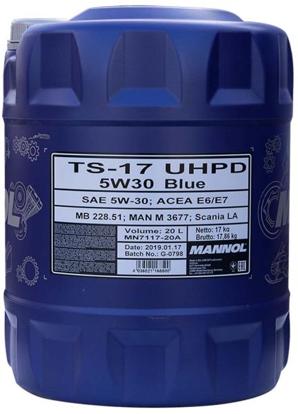 Mannol 7117 TS-17 UHPD Blue Truck Special 5W-30 motorolaj, 20lit Energiatakarékos szintetikus (PAO-alapú) motorolaj a legújabb generációs nagy teljesítményű és nagy sebességű dízelmotorokhoz turbófeltöltéssel és anélkül, nehéz körülmények között alacsony kéntartalmú üzemanyaggal. Kifejezetten arra tervezték, hogy megvédje a gépeket, és a legtöbbet hozza ki abból, f