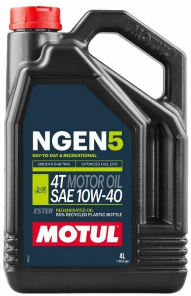 innovatív, a fenntarthatóság jegyében készített motorolaj négyütemű motorkerékpárokhoz A Motul NGen5 4T 10W-40 innovatív, a fenntarthatóság jegyében készített motorolaj négyütemű motorkerékpárokhoz. Szintetikus észterekkel, magas színvonalat képviselő alapolajokkal, nagy teljesítményű adalékanyagokkal és 75%-ban regenerált olajokkal előállított új generációs k