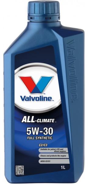 5W30 motorolaj - Valvoline All Climate - C2/C3 - 1liter Kiváló minőségű, szintetikus motorolaj, amely motorok széles köréhez használható. Kifejezetten ajánlott kipufogógáz utókezelő rendszerrel (dízel részecskeszűrő, háromutas katalizátor) szerelt járművekhez, ahol ACEA C2 vagy C3 teljesítményszint az előírás (pl. Toyota, Hyundai, Kia, Nissan). Teljesítményszintek: AC