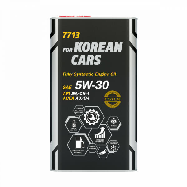 Mannol 7713 Korean Cars 5W-30 motorolaj 4lit. A Mannol 7713 Korean Cars 5W-30 egy energiatakarékos, teljesen szintetikus motorolaj, kifejezetten a turbóval vagy anélkül szerelt Kia és a Hyundai motorok speciális igényeihez fejlesztve. Különösen alkalmas a 2005-tõl készülõ CVVT vezérlésű 2.0L Beta I4 motorokhoz, valamint a 2006-tól készülõ DOHC Alpha II motorokhoz, biztosítva