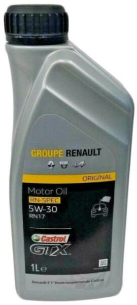 RENAULT RN 17 Termékleírás A Renault - Castrol GTX RN-SPEC 5W-30 RN 17 teljesen szintetikus motorolaj. Mindazokhoz a benzin- és dízelüzemű motorokhoz alkalmas, amelyekhez RN 17 jóváhagyású motorolaj használatát írták elő. A legszigorúbb minőségi követelményeknek is megfelel, széles hőmérsékleti tartományban gyors átolajozást biztosít, így hatékonyan hozzájárul a mo