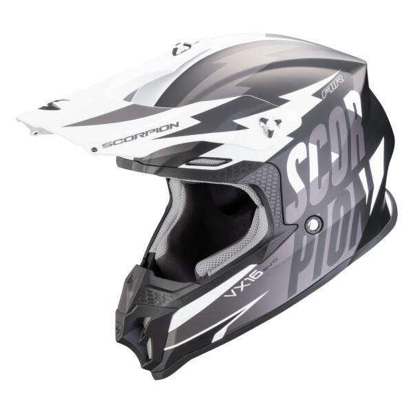 Rendkívül biztonságos és kényelmes motokrossz bukósisak, a Scorpion VX-16 EVO. Főbb jellemzők és specifikációk: Kialakítása - motokrossz sisak Anyaga - könnyű és tartós polikarbonát Hipoallergén KWIKWICK2® LINER belső teljesen kivehető és mosható A KWIKFIT rendszer lehetővé teszi a dioptriás szemüveg használatát Lehetőség az arcpárnák felfújására az AIRFIT CON