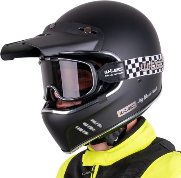 A W-TEC Black Heart Retron Chesster Bukósisak motoros szemüveggel ideális választás a retro motocross rajongóknak és a Café racer stílus kedvelőinek. Ez a sisak remekül ötvözi a vintage dizájnt és a 70-es évek hangulatát a modern kivitelezéssel és biztonsági szabványokkal együtt. A levehető napellenző megvédi a szemed a naptól és a portól, míg a hátsó pánt lehetőv