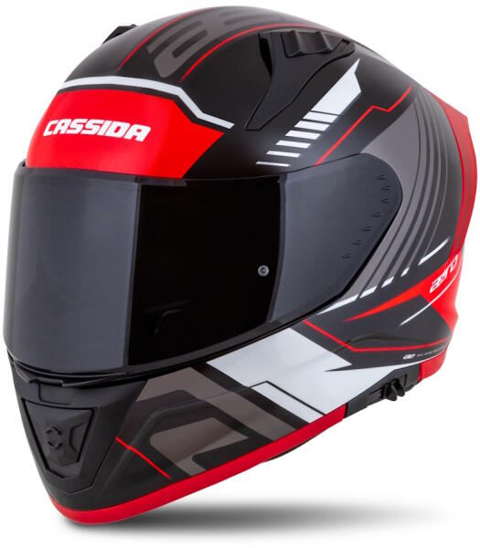 A Cassida Aero Drome fekete gyöngy/piros/fehér/szürke Bukósisak egy integrált sisak polikarbonát héjjal és aerodinamikus spoilerrel, amely jellegzetes, szokatlan színezéssel rendelkezik, ami kiemeli a sisakot a tömegből. Az antibakteriális komfort bélés, a vezeték nélküli kommunikátoros fejhallgató előkészítés, a Cassida Helmets prémium csomagolása és a készletben talá