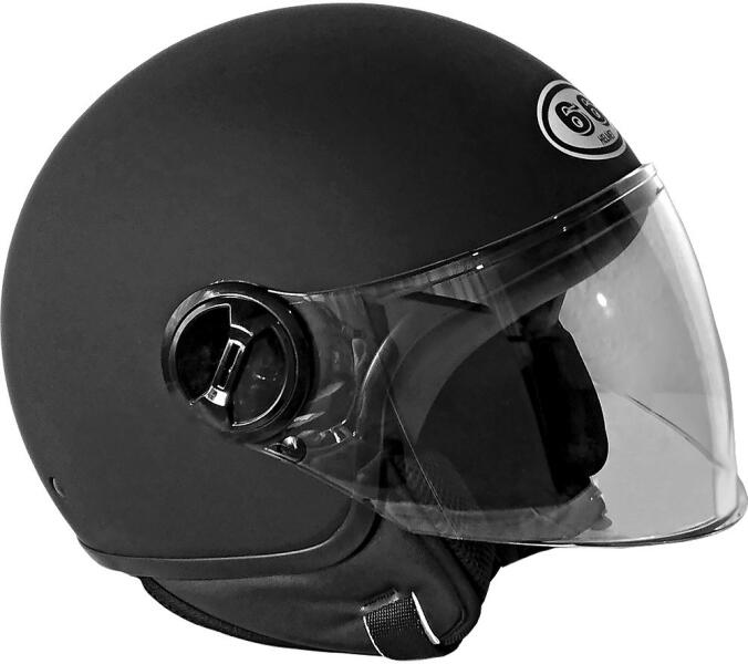 Helmet66 FG131 matt fekete nyitott bukósisak. Gyors csattal könnyen állítható, ABS héjszerkezet, feltolható karcálló plexi, bélése könnyen tisztán tartható. CE tanúsítvánnyal rendelkezik. Könnyített, puha fül rész a maximális kényelem érdekében.