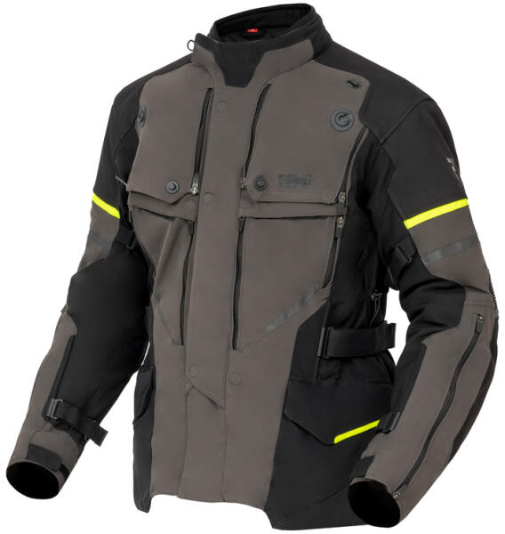 Rövid textil kabát kopásálló poliészter külső réteggel, 600D kötéssel, dupla PU bevonattal. Kivehető termo belés. Megerősítés a könyök és a vállak területén a nagyobb kopásállóság érdekében. Szellőző cipzárak elhelyezve a vállak alatt. Alacsony gallér kellemes puha anyaggal. CE minősítésű levehető váll- és könyökprotektorok NUCLEON FLEX PLUS CE 1. szintű.