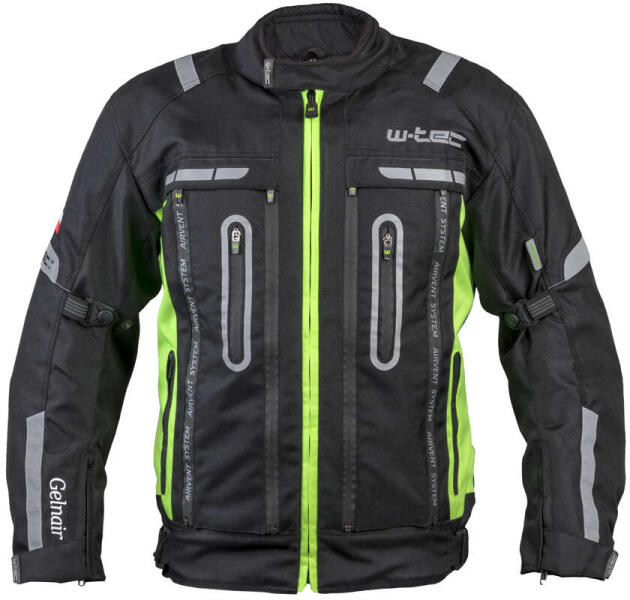 A W-TEC Gelnair motoros kabát kiváló szellőzőrendszerrel rendelkezik, és magas minőségű anyagok kombinációjával készült. A kritikus ütközési pontok (hát, váll, könyök) tanúsított, 2. védelmi szintű, kivehető gumiprotektorokkal vannak ellátva. A külső kabát anyaga egy tartós poliészter anyag, fluoreszkáló zöld Visionight fényvisszaverő elemekkel ellátva, amelye