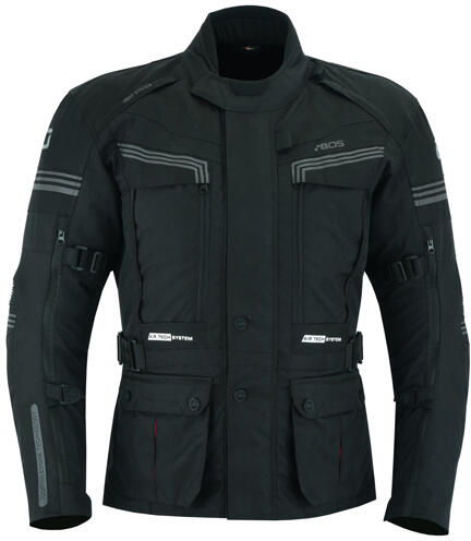 A BOS Maximum t úramotoros kabát kiváló minőségű anyagból, teflon bevonatú 600D poliészterből készült. A kivehető termikus béléssel ellátott kabát vízálló, szélálló és légáteresztő. A 8 szellőzőnyílás kiváló szellőztetőrendszert biztosít, aminek köszönhetően a meleg nyári napokon is viselheted a kabátot. A kabát három külső és három belső zsebbel re