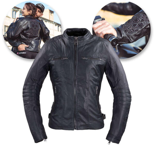 Ha biztonságos és kényelmes motoros kabátot keresel, amely nem csak jól néz ki, hanem lehetővé teszi, hogy kiemelje nőies vonalaidat, akkor a W-TEC Strass női motoros bőrdzseki a Neked való! A lágy és rugalmas báránybőrt ötvözi a koponya alakú dekoratív rávarrások. A hátulján egy nagy „santa muerte rávarrás található, a bal ujján pedig egy másik, kisebb ugyanilyen.