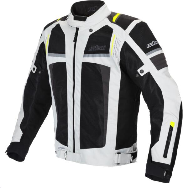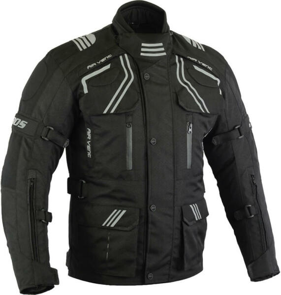 A férfi touring motoros kabát BOS Temper minőségi, 3-rétegű, Cordura anyagból készült. A kabát kiváló tulajdonságokkal rendelkezik, mint a kivehető bélés, légáteresztés, vízhatlan, ellenálló a széllel szemben. A kabát légáteresztő paneleinek köszönhetően tökéletes viselet még melegebb, nyári időben is. A kabát számos zsebbel van ellátva (9 külső és 3 belső