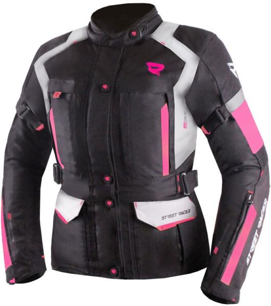 Adventure motoros kabát Street Racer. Minőségi és biztonságos motoros kabát az utazások során várható kalandokhoz! Főbb jellemzők és specifikációk: Anyaga: poliészter. Belső mesh bélés. Kivehető vízálló membrán. Kivehető termikus bélés. CE váll- és könyökprotektor Level 2. Előkészítés gerincprotektorhoz (a protektor nem tartozék). AIR COOLING SYSTEM a mellkason.