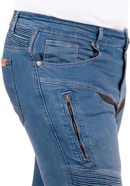 A W-TEC Dynetis férfi motoros farmer a kivételes biztonság, kényelem és stílus kombinációjának köszönhetően ideális társ minden útra. A csípőnél és a térdnél stratégiailag elhelyezett sztreccs panelek biztosítják a maximális mobilitást és kényelmet motorozás közben. Az ágyéktájon és a combok belső részén található rugalmas anyag biztosítja a mozgás szabads