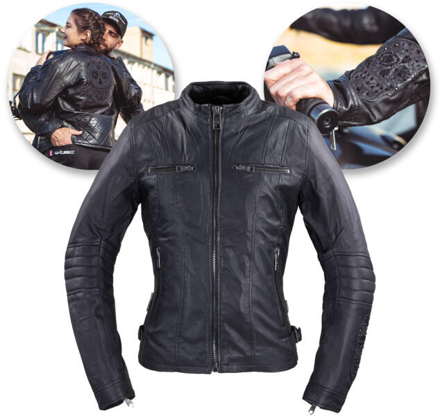Ha biztonságos és kényelmes motoros kabátot keresel, amely nem csak jól néz ki, hanem lehetővé teszi, hogy kiemelje nőies vonalaidat, akkor a W-TEC Strass női motoros bőrdzseki a Neked való! A lágy és rugalmas báránybőrt ötvözi a koponya alakú dekoratív rávarrások. A hátulján egy nagy „santa muerte rávarrás található, a bal ujján pedig egy másik, kisebb ugyanilyen.