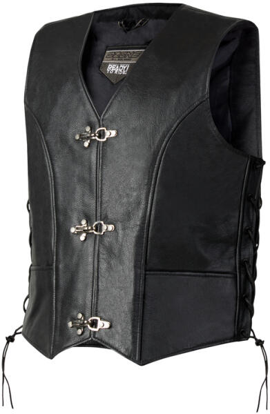 A mellény 100% -ban minőségi bivalybőrből készül. Kellemes poliészter bélés. Dupla varratok a tartósság érdekében. 2 belső és 2 külső zseb kis tárgyak tárolására. Az oldalakon található stílusos fűzés szintén a jobb illeszkedést szolgálja. Rögzítés fém karabinerekkel. Stílusos mellény, amely kitűnni fog!