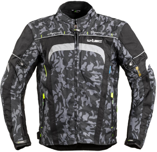 A W-TEC Torebaro férfi motoros kabát tartós, poliészter motoros dzseki, egyedi, vagány terepmintás stílusban. A nagy igénybevételnek kitett helyeken (azaz a könyökön, a vállon és a háton) kivehető protektorok és a stratégiailag elhelyezett Visionight fényvisszaverő elemek biztonságban tartanak motorozás közben. Mivel a kabát EN 13595-1 tanúsítvánnyal rendelkezik, megfele