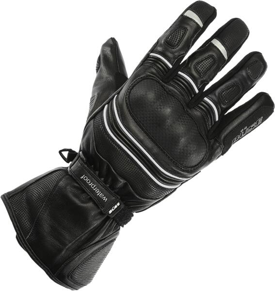 Külső anyaga Fibretech 600D és kecskebőr. Vízálló membránnal ellátott motoros kesztyű. Pamut thermo bélés. Protektorral. Megerősített bőr tenyérrész, csúszásgátló bevonattal. Érintőképernyő kompatibilis. Közepes hosszúságú. EN 13594: 2015. Méret: T5-T9.