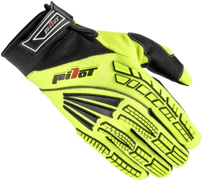 A PILOT motoros kesztyű különösen alkalmas motokrosszhoz, de robogózáshoz vagy quadozáshoz is. Főbb jellemzők és specifikációk: Anyaga - 500D sztreccs poliamid Gumiprotektorok a kézháton A kesztyű belső oldalán lévő gumírozott tenyér biztosítja a biztos fogást a gépen Tépőzáras pántok a csuklón a jobb tartás érdekében a motoros kesztyű