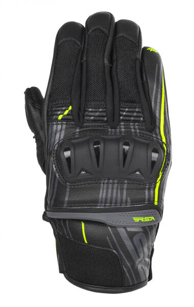 A kesztyű valódi bőr és poliészter kombinációjából készült. Belső PU bélés. Kemény műanyag ízületprotektor. Megerősítés a tenyérrészen dupla bőrréteggel. Gumi ujjvédők. Harmonika panelek az ujjakon a mobilitás megkönnyítése érdekében. Finger touch, amely lehetővé teszi az érintőképernyők vezérlését. Rögzítés tépőzáras mandzsettával. A kesztyűk a CE