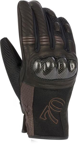 Perforált nyári kesztyű. Kecskebőrből készült. Karbon szálas protektorral. Megerősített tenyérrész, csúszásgátló bevonattal. Csuklónál szűkíthető. Érintőképernyő kompatibilis.