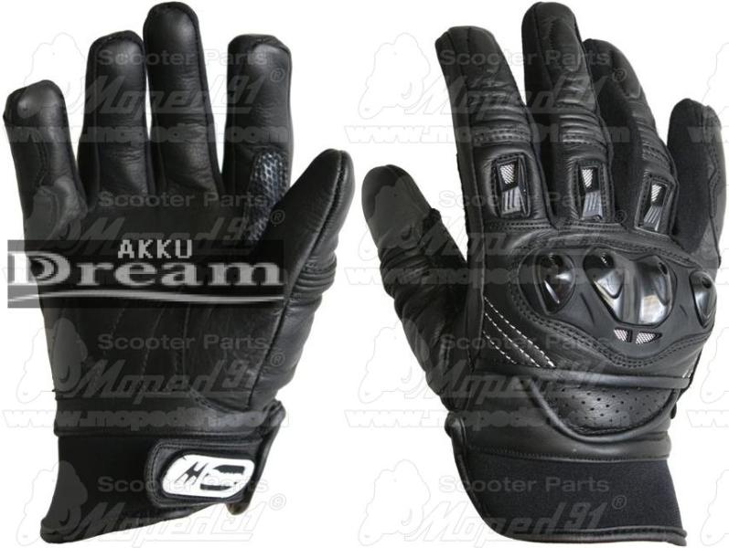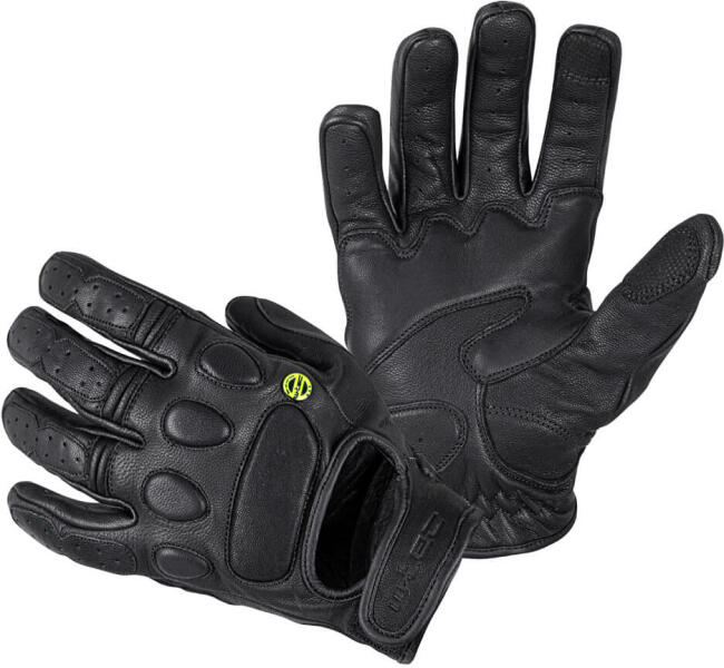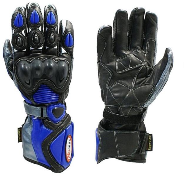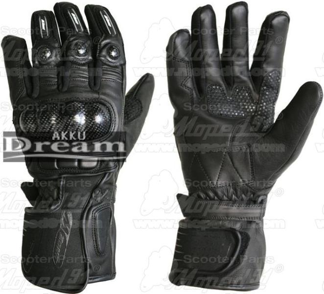 Csúcsminőségű marhabőrből, karbon-kevlár protektoror a kézfejen és az újjakon, megerősített tenyérrész, csuklónál állítható pánt, poliészter béléssel, fekete színű