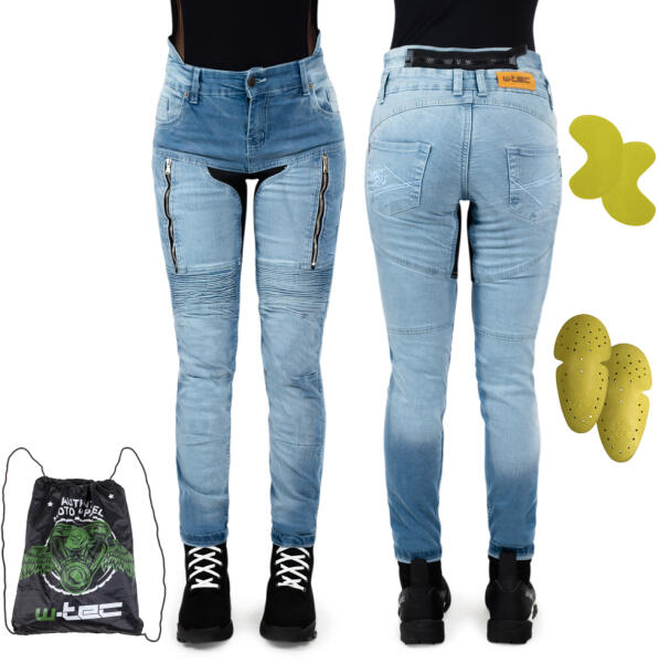 A W-TEC Grandea EVO női motoros farmernadrág kényelmes, enyhén rugalmas és anatómiailag formált, így tökéletesen illeszkedik. A magas derékrész (főleg a hát alsó részén) alkalmassá teszi a farmert motorosok számára. A nagy igénybevételnek kitett helyeken aramiddal megerősített szövet található, amely tartós és kopásálló. A levehető, tanúsítvánnyal rendelkező t