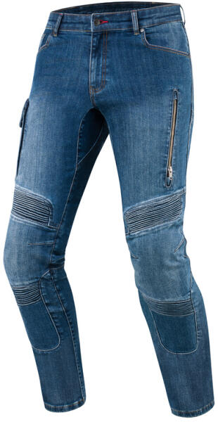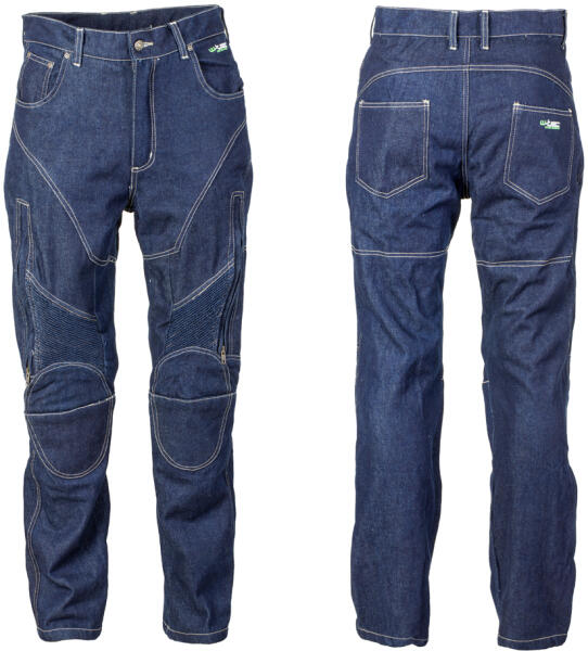 A farmernadrág 90% pamut, 10% poliészter és 2% elasztán anyag kombinációjából tevődik össze. Az elasztánnak köszönhetően a nadrág tökéletesen rugalmas és követi a test formáját. Aramidszálas megerősítéssel létrehozott béléssel KEVLAR® DUPONT. CE kivehető térdprotektorokkal – level 2 (a protektorok magassága állítható). CE kivehető csípőprotektorral – level