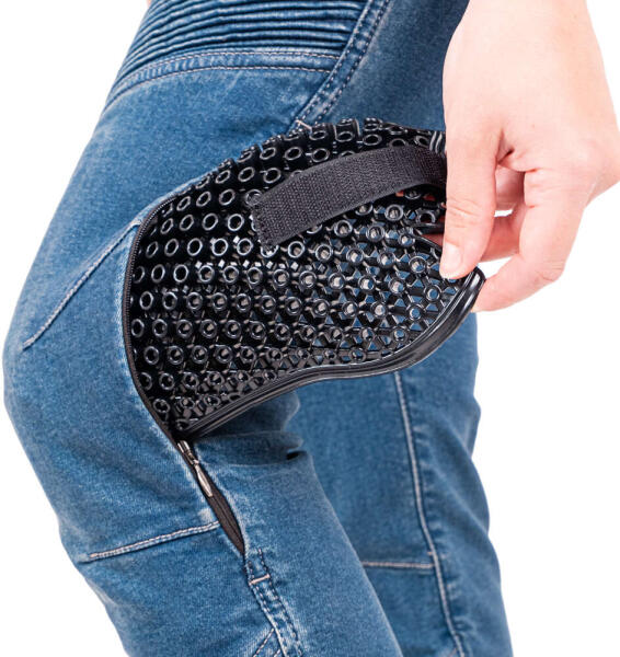 Női fazonú protektoros farmer. DuPont Kevlárral erősítve. Állítható magasságú Trilobite CE LEVEL 2 térdprotektor. Trilobite CE LEVEL 2 csípőprotektor. Állítható szellőzők. YKK, fém cipzárak. Több külső zseb. Stretch betétekkel. Két különböző szárhosszal. 1 év garancia. Plusz vízálló zsák. Méret: 26-36.