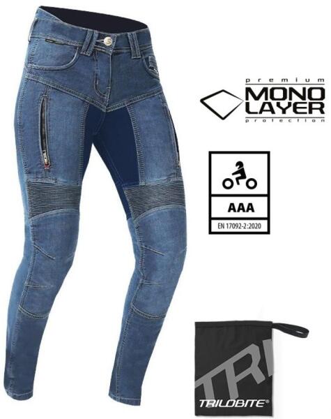 Protektoros farmernadrág. Anyaga: Tri-Stretcher® PRO 2.0 farmer. Trilobite CE level 2 térd és csípőprotektor + farokcsont védő. Stretch betétek. Hármas varrás. Egyrétegű. Több külső zseb. YKK, fém cipzárak. Méret: 26-36.