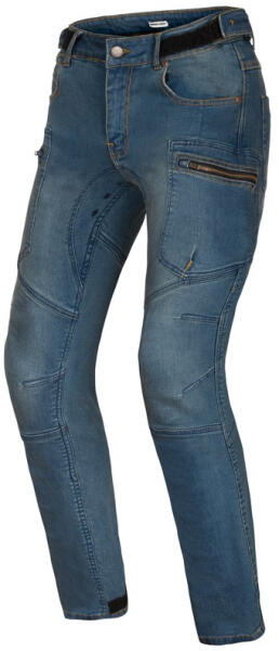A farmernadrág 98% pamutot és 2% elasztánt tartalmaz. Aramidszálas KEVLAR® DUPONT megerősítéssel. A farmer tartozékai a CE jóváhagyott térd-és csípőprotektorok – (level2). A térdprotektorok magassága állítható. Zseb a farcsontprotektorhoz. Szellőzés az ágyéktájon a jobb légáteresztés érdekében. Csípőben szűkíthető a tökéletes illeszkedés érdekében. Dupla