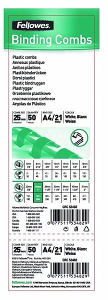 - 19 mm-es, 21 gyűrűs műanyag spirálok - Spirálozási lapkapacitás: 121-150 lap - Kiszerelés: 100 db/ csomag - Szín: fehér - Spirálhossz 30 cm Gyártó/első EU forgalmazó elérhetősége: Fellowes Holdings B. V. Gesworehoekseweg 3a 5047 TM Tilburg, Neatherlands CS-benelux@fellowes. com www. fellowes. com