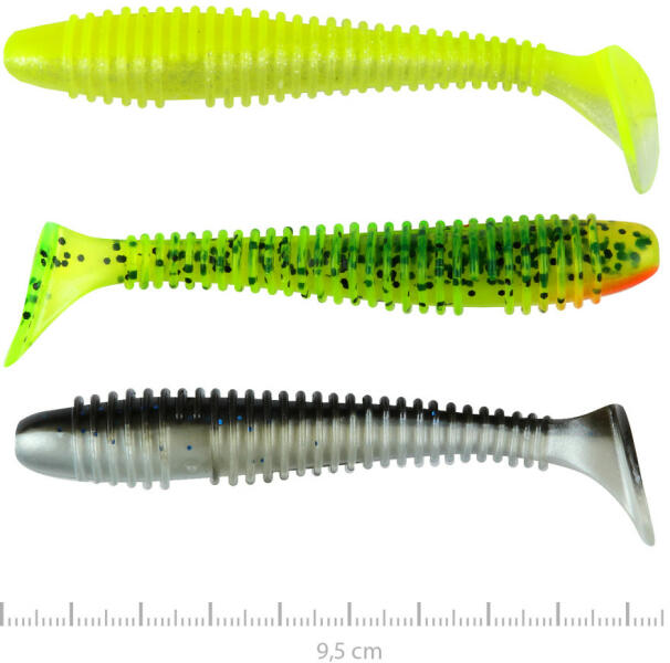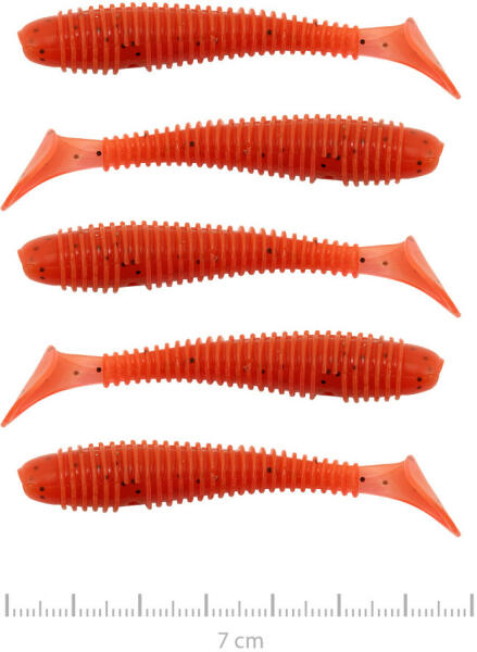 A bordás teskialakításnak köszönhetően nem csak a farok rész ad le rezgéseket, hanem a test is. Off-set horoggal szerelve a vízinövényes helyen is eredményesen használható! A lágy gumikeveréknek köszönhetően egyedi mozgása van, amellyel a tesztelések során rengeteg süllőt és sügeret adott. Csalogató anyagot tartalmaz. Speciális puha silicon anyaga nagy szakitószilárds