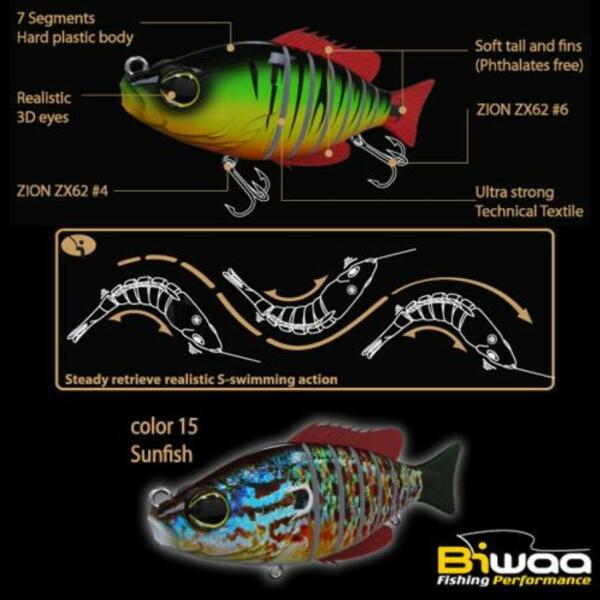 A korábbi modellekhez képest a fejlesztésekkel az új Biwaa Seven Section 2.0 wobblerek dinamikusabb és természetesebb mozgást mutatnak, még a nagyon lassú behúzásoknál is. A szegmentált test 7 szakaszból áll. A használt textilszövet több mint 18 kg-os erőt bír ki, és az anyag nem megy tönkre néhány támadás után sem. Ezeknek a wobblereknek a fotó realisztikus kivitelezé