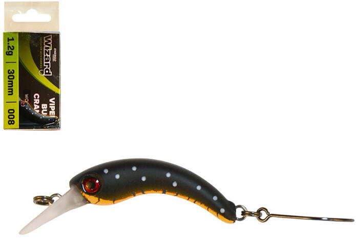 Wizard Viper Bug Crank wobblerAmikor a kanalak elvesztik hatékonyságukat, eljött az ideje, hogy egy „érdekes csalit helyezzünk a vízbe, amely még nagyon kis sebességgel is nagyobb víztömeget mozgat meg, stimulálva a ragadozókat. Dupla hasított gyűrűvel és szimpla acélhoroggal, bordás, vegyileg élezett heggyel. Ideális tenyésztett pisztrángokhoz és őshonos folyami pisztrá